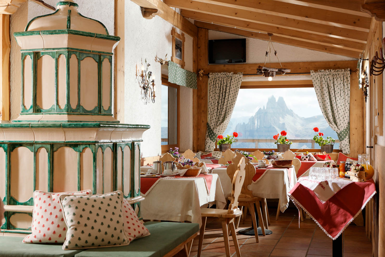 Stepping into the restaurant at Rifugio Pomedes is like stepping back in time. With its rustic interior, exposed wooden beams, and quirky decor, this mountain hut is the perfect place to really immerse yourself in the mountain culture of yore. The restaurant at Rifugio Pomedes features simple, home-cooked meals, authentic to the Ampezzo region — Tyrolean cold cuts and cheeses, casunziei (half-moon shaped pasta) filled with beets, and beef goulash to name a few. The hut has a large terrace where you can dig into your scrumptious spread with views of Monte Pelmo, Croda da Lago and Lastoni di Formin.