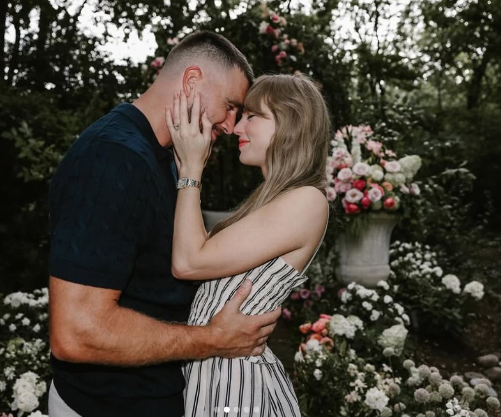 Baby, Just Say Yes. And yes, she did. It’s official: Taylor Swift and Travis Kelce are engaged, and they announced it on Instagram for the world to see. Taylor didn’t disappoint the fans either — she posted a close-up of her ring, which is as unique as Taylor is. A thin gold bezel encases the oval square diamond. Travis did well — experts estimate the ring around 7–10 karats and easily worth $1 mil. With these two, though, it’s like the ring is secondary. Sometimes, two people just fit together, and our money is on Taylor and Travis going the distance. We actually thought the engagement already happened, and they just took time to enjoy the news in privacy earlier this summer. But, clearly timing is everything. As Taylor announced on her Instagram, the gym teacher and English teacher are getting married.