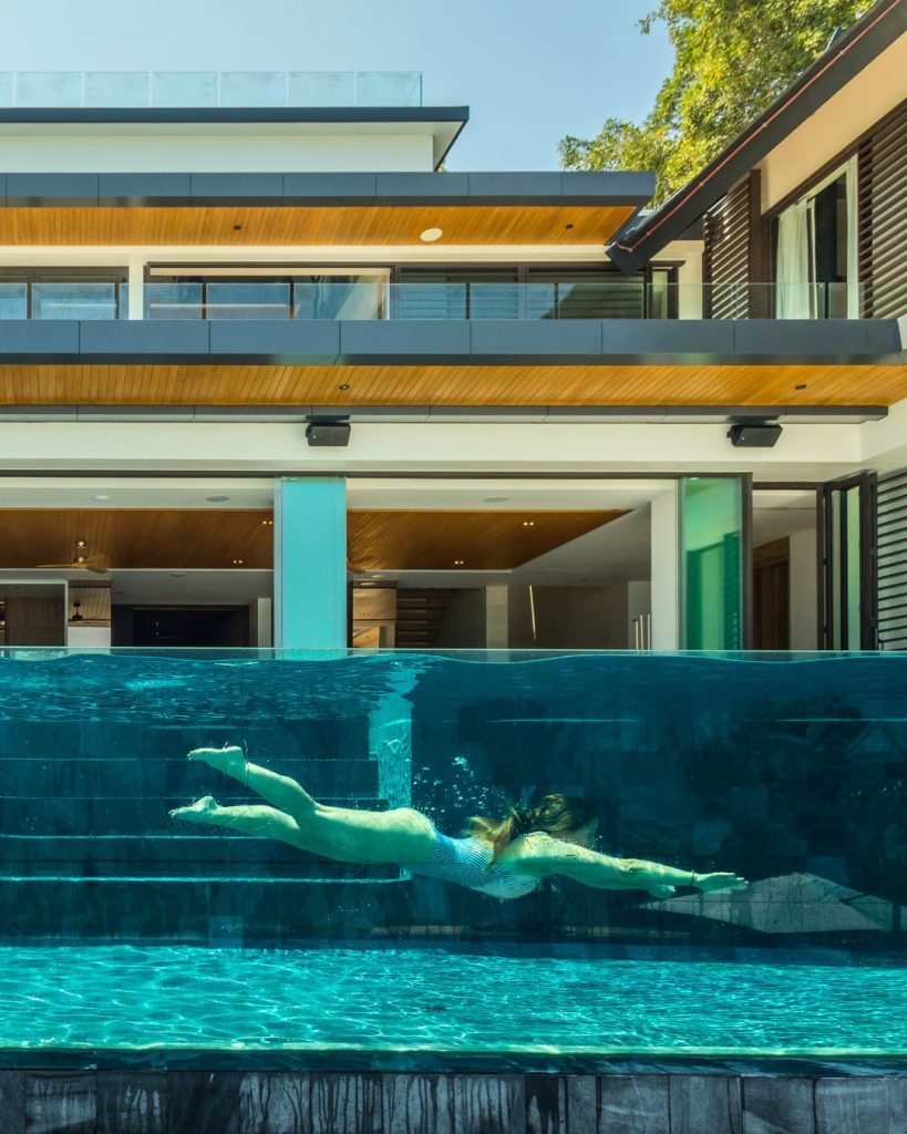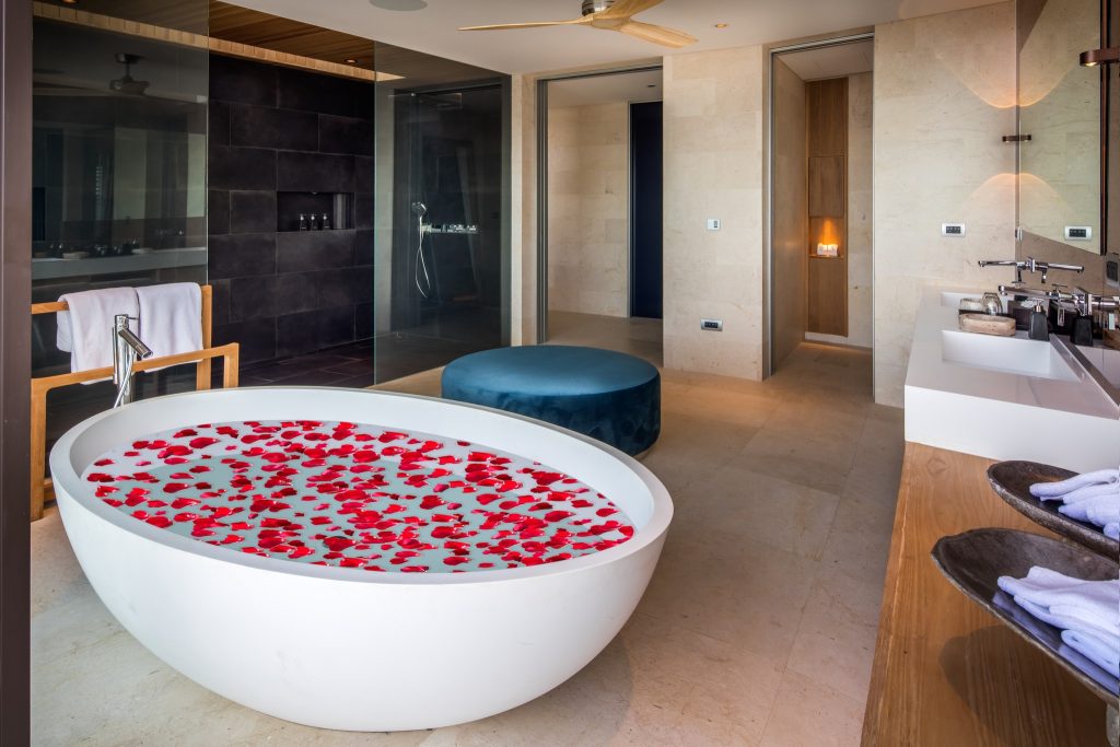 Amaravida has eight enormous bedrooms, each with floor-to-ceiling windows. And enough space to dramatically throw yourself onto the bed after an emotionally complex day. The interiors are a mix of minimalist chic and comfort. Certainly, you won’t find any seashell lamps or rattan fish there. The bedrooms are spread across different levels, offering privacy when needed. And, you have a beautiful gathering space downstairs, when it’s time to toast to nothing in particular. The bathrooms are equally impressive, with all the oversized tubs and rain showers. And the views might make you linger a little longer with that hair mask.