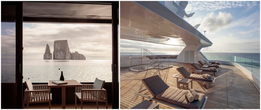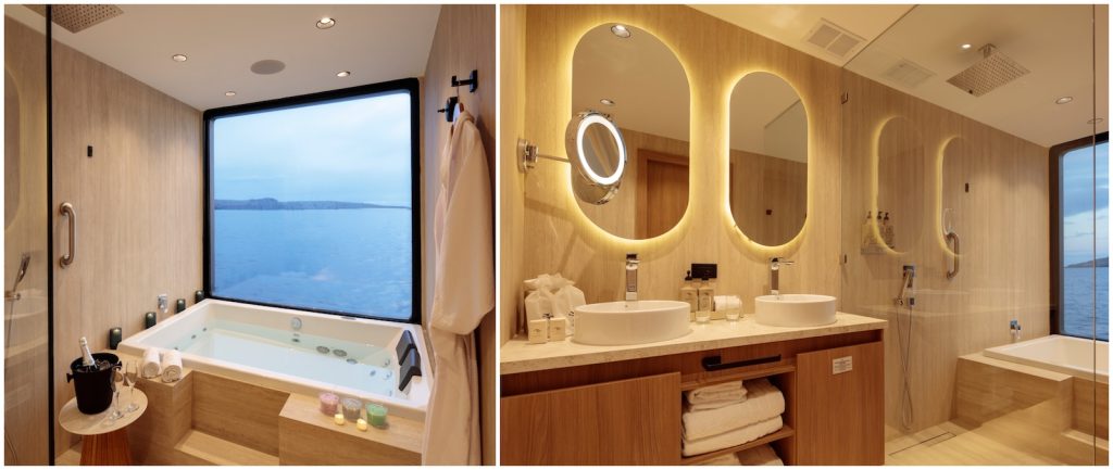 Hermes has 12 suites spread over the upper and main decks: 10 double suites and two single suites. All of the suites have private balconies and floor-to-ceiling windows, both of which are essential to spot the extraordinary wildlife and admire the unique scenery. After all, that’s why you traveled all the way there: to see. Each suite is also equipped with a walk-in closet and an enormous bathroom with two sinks, a shower, and a jet tub alongside a large window. (The whales and turtles won’t mind seeing you in your birthday suit, we promise).