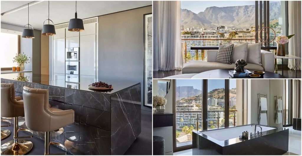 Lion’s Head Penthouse is the only penthouse at One&Only Cape Town, and it is huge with 8,590 square feet of space. There are four spacious ensuite bedrooms to accommodate up to 8 guests. There are also several lounges, a kitchen, a dining room, a bar, and no fewer than three large patios complete with dining and sitting areas and a plunge pool. The decor is elegant and modern, with contemporary art pieces sprinkled throughout, and a neutral color palette. And the best part is that all the rooms have floor-to-ceiling windows, so you never lose sight of the views. Oh, and there’s an elevator for you to go between the two floors without breaking a sweat.