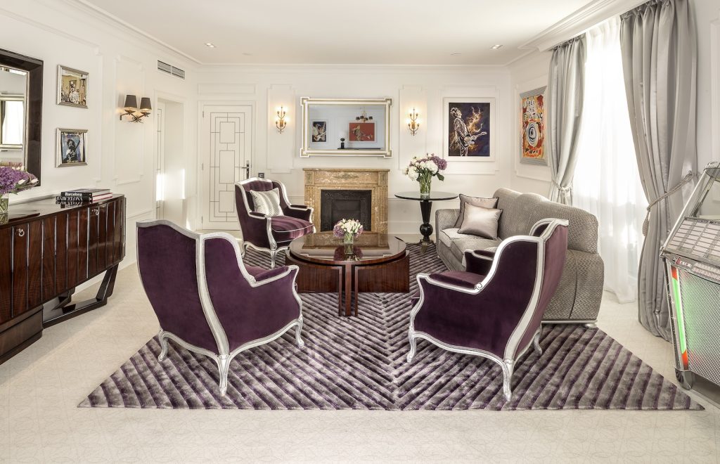 But while most of the accommodations are decorated in the fashion of a traditional luxury hotel, it’s not the case for all of them. Two of the suite types are entirely different. The Joséphine Baker Suite is a colorful explosion of very feminine florals, transporting you to a property in the countryside. The Ronnie Wood Suite (designed with his input) has a very masculine vibe. The furniture is more contemporary, there is Rolling Stones art on the walls, and there is even a jukebox. If you’ve always wanted to feel like a rock star, this is the suite for you.