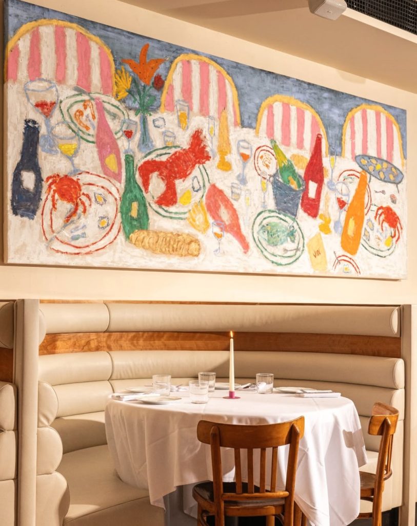Finally, Dame and Lord’s have a restaurant and location that reflect their success and station in life. Crevette NYC is at 10 Downing, a location that has had many a scene-y restaurant, including the most recent Holiday Bar. The one torch that Crevette is carrying from the previous tenant is the vibe. The space is beautifully decorated with cheerful art and a warm hue to the lighting. There’s an elevated feel to the room, with white tablecloths and candlelit tables.