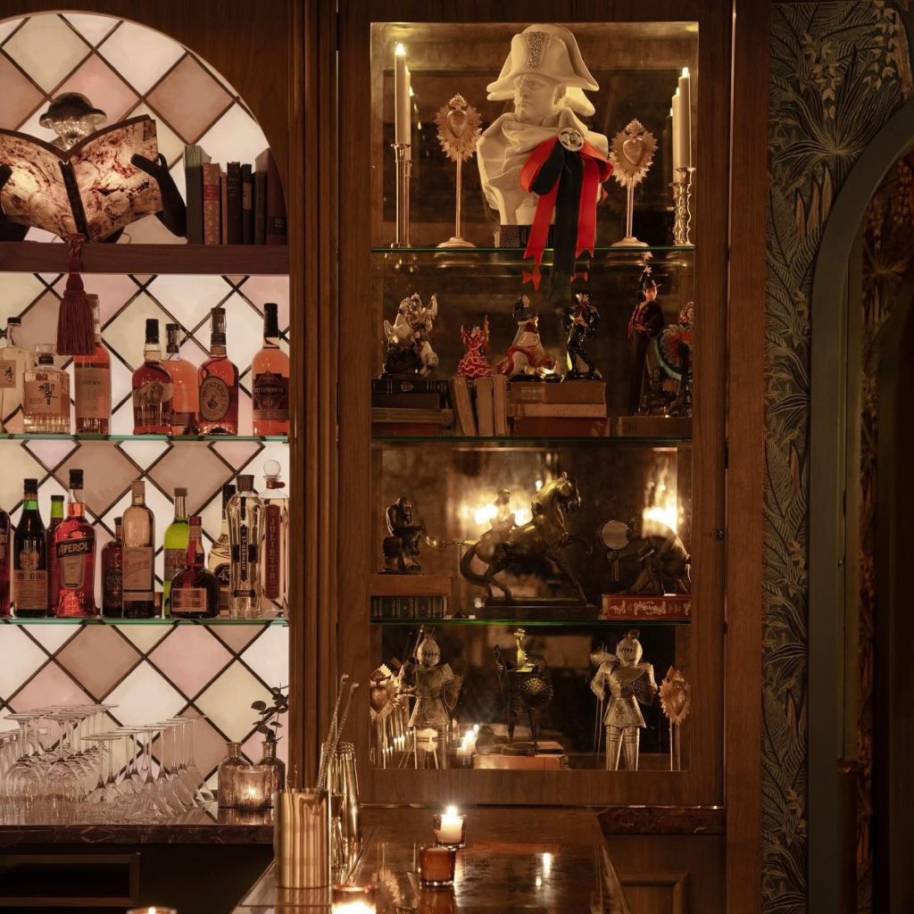 The bar’s interiors are a stylistic hybrid: there’s hand-carved walnut millwork, taxidermied birds, pink stained glass windows, candelabras, and custom tapestries. A suit of armor is enshrined in a glass case, and Murano chandeliers dimly light the dramatic ambiance.