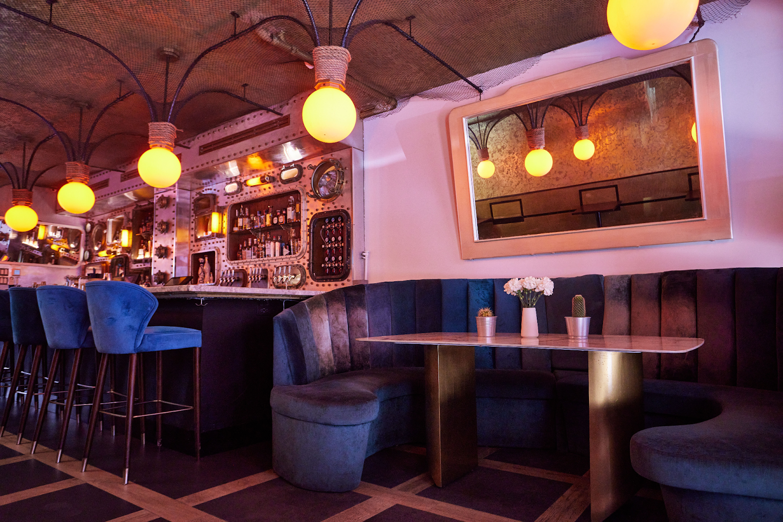 Aquarelle’s layout is as immersive as its menu, with six distinct areas offering unique underwater-inspired environments. The lounge houses the bar in an industrial, submarine-like room adorned with ship renderings and nautical sconces.