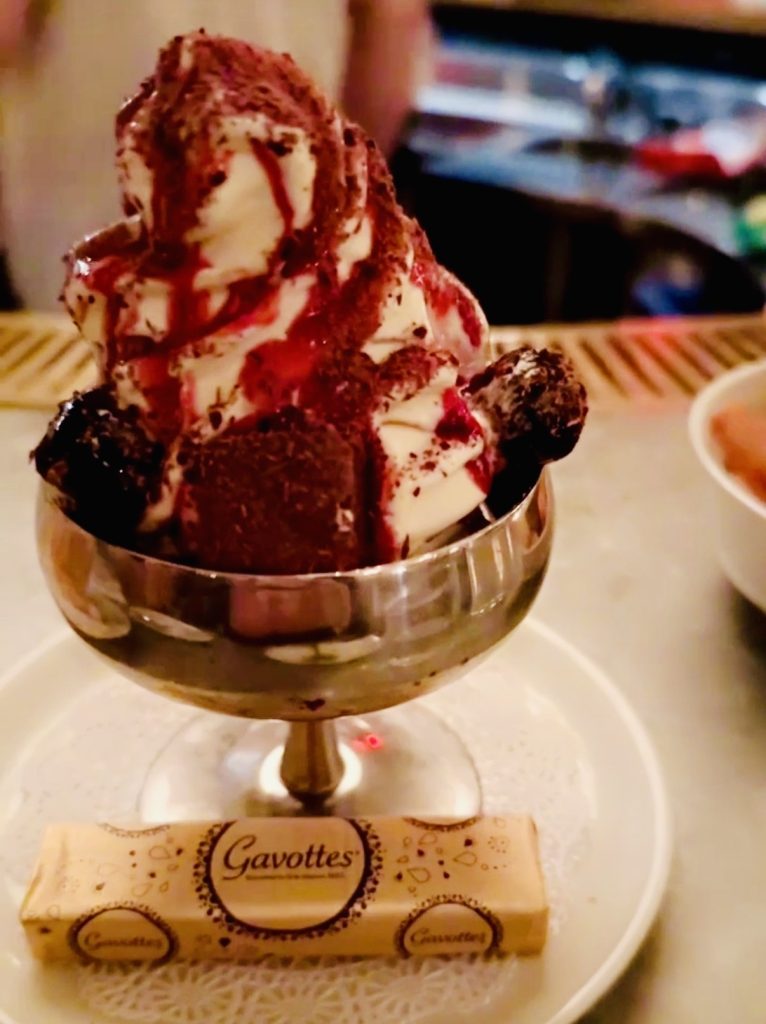But to back up, we started with the Caesar salad, which was topped with the perfect amount of thinly shredded parm. I liked that the dressing was both rich and light. The oysters and diver scallop on the raw bar were also exceptionally fresh and prepared with just the right sauces to make them memorable. My friend went for the thighs and fries, and was not disappointed. I was just happy to partake in the fries. If I had more room, I also would have ordered the fettuccini Alfredo — another specialty of the house. Instead, we saved room and had both the coconut cake and sundae for dessert.