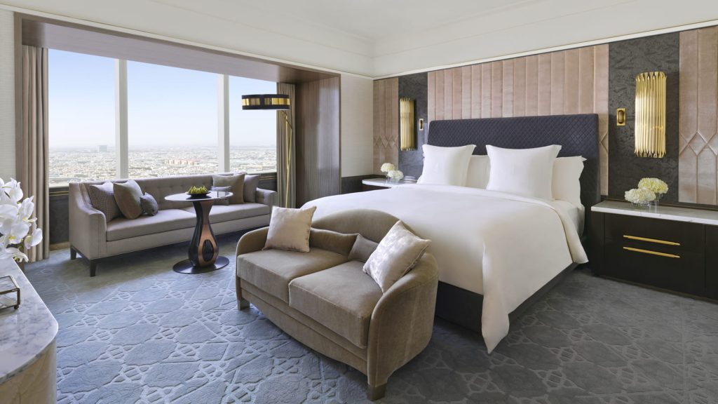 Perched high in the iconic Kingdom Tower, the Four Seasons Hotel Riyadh is a masterclass in modern luxury with unmistakable Saudi flair. You’ll find the rooms spread across floors 30 to 50. They offer some of the best sweeping views of the capital (it’s all about sleek interiors and warm regional touches). You can (and should) indulge in Michelin-inspired dining at Café Boulud, unwind with royal hammam treatments at the spa, or shop with direct access to Kingdom Centre Mall. Regardless of whether you’re in town for business or leisure, this hotel delivers elegance, comfort, and a front-row seat to Riyadh’s transformation.