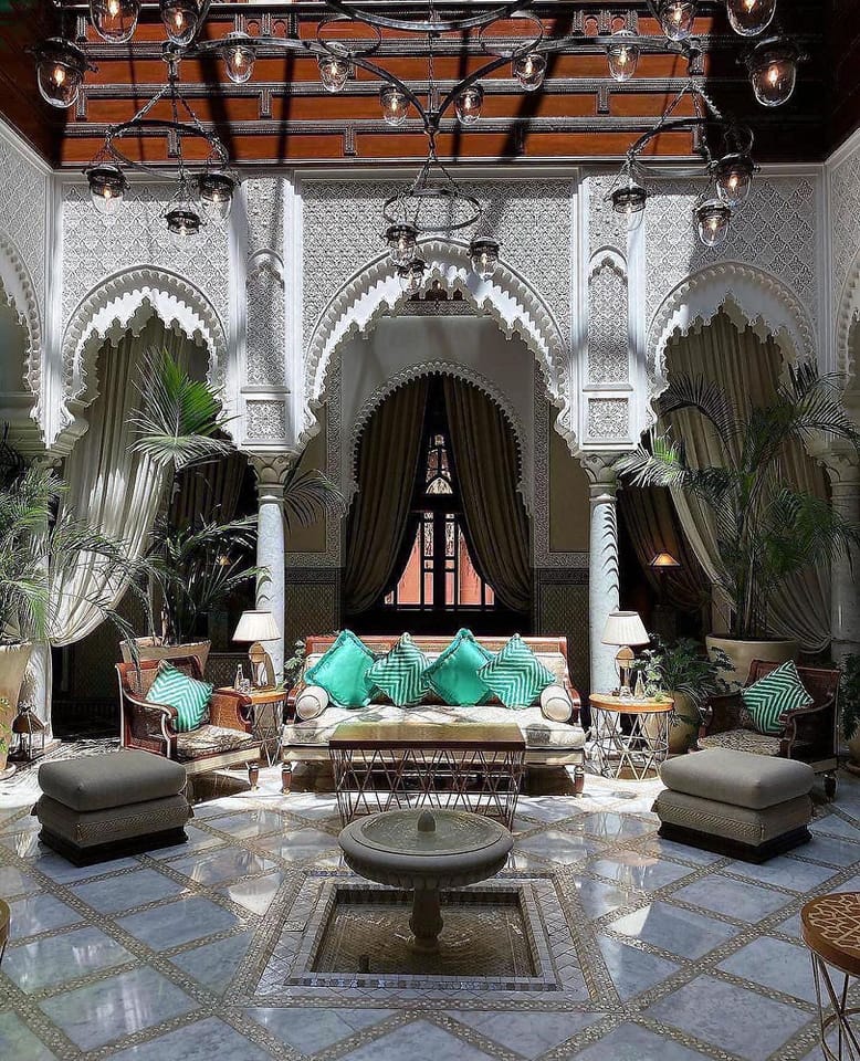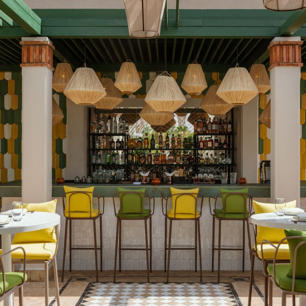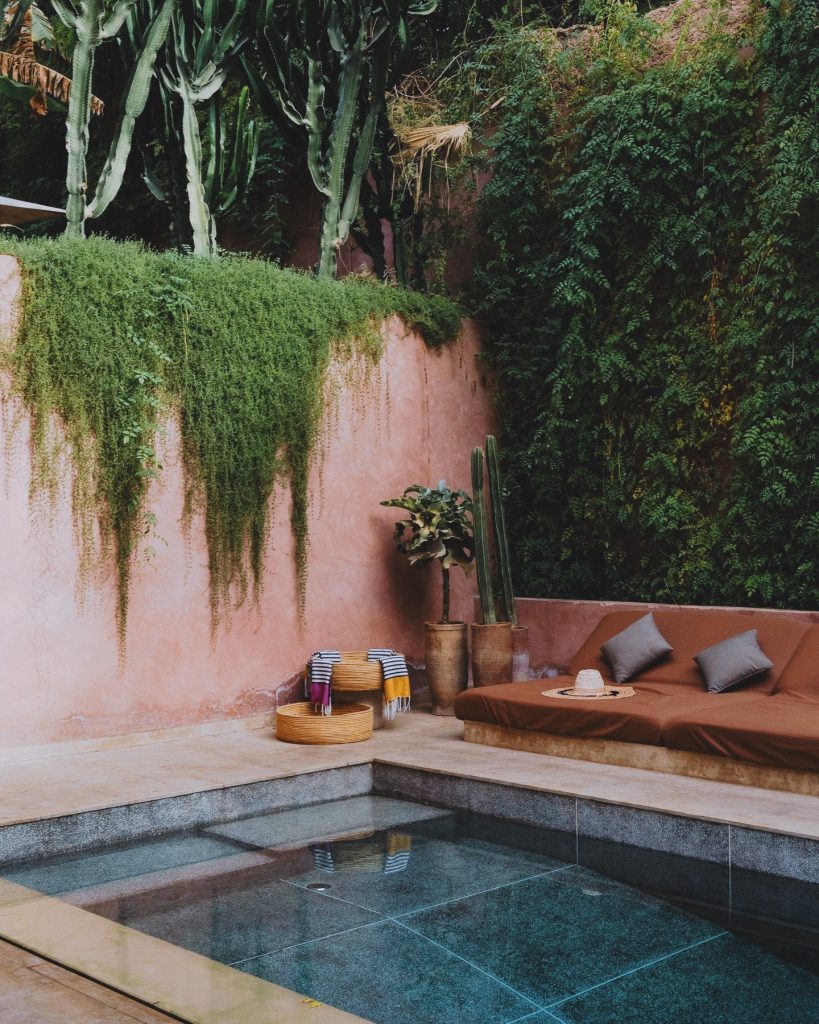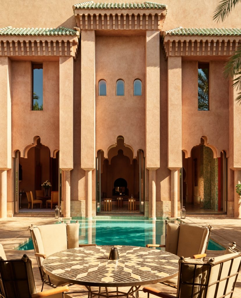 Further away from the city center, you’ll find Amanjena, aka the king’s hangout. The property draws inspiration from the Red City of Marrakech’s storied past. The surrounding gardens create a serenity you can only find when you leave the city center. Think olive groves, fountains, gazebos, and private pools with the Atlas mountains as your view. Amanjena focuses its design on structure more than textiles, with dramatically high archways, pillars, and furniture carvings. They also offer dining nooks throughout the property, whether you choose to have a Berber dinner in an Amanjena tent (after you’ve traveled by camel) or plan a picnic in the olive groves. On a side note, this is a tennis hotspot with skilled LUX coaches, a personal program, and a Petanque Court to satisfy your competitive side.