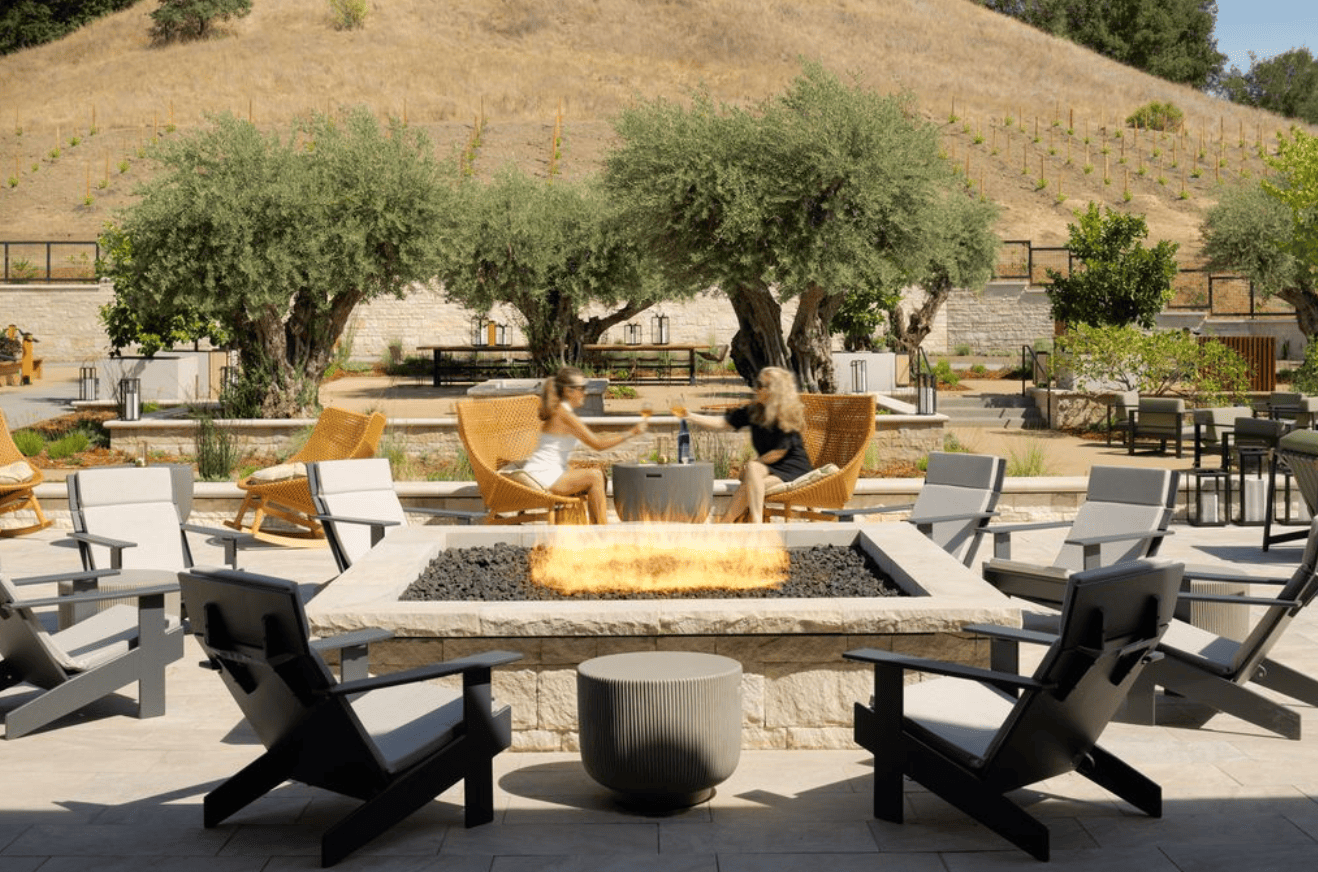 Guests gravitate to the lobby’s central open hearth grill in Folia’s dining room, which seats 200 for breakfast, lunch, and dinner. Floor-to-ceiling windows, an open kitchen, and terrace with fire pits, garden beds, olive trees, and fruit trees beyond set the tone for wine country dining. As the day draws in, they may head for the rooftop bar and restaurant. It’s where million-dollar sunsets and stargazing await.