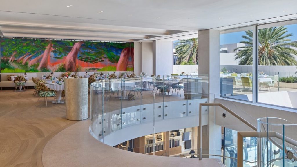 Monsieur Dior sits on the third floor of Dior’s flagship at 323 North Rodeo Drive, a four‑story space the brand calls a “temple to French luxury.” The restaurant is designed as an extension of the house’s world: sculptural, polished, and quietly cinematic. A glass‑enclosed garden blurs the line between indoors and out, giving the space a serene, gallery‑like feel.