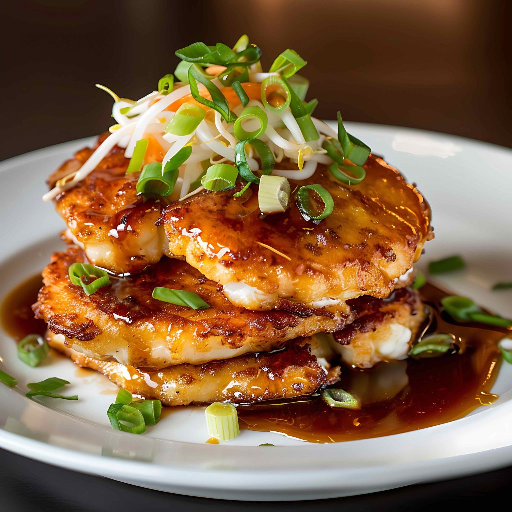 Arrange the egg foo young on plates and generously ladle the warm brown gravy over the top. Garnish with extra sliced green onions and serve immediately with steamed ginger rice.