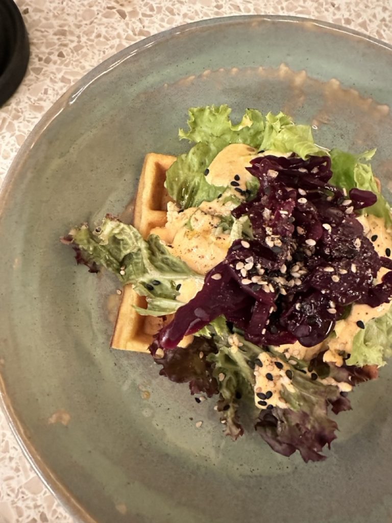 In a city where every cobblestone seems to have a story, it’s no surprise that Rome is also home to inventive cuisine that bridges tradition and modern flair. Inspired by a standout dish served at Six Senses Rome, we are doing a take on our favorite breakfast staple: the waffle. Only this time there’s nothing sweet or syrup-soaked here. Instead, this cabbage waffle recipe leans savory and sophisticated. The base is of fermented cabbage-infused waffles that bring a subtle tang and satisfying complexity. And paired with chickpea hummus, a nod to the Mediterranean’s love affair with legumes. It’s topped with a crisp green salad tossed in spicy yogurt dressing. The dish is bold but balanced, very much like the Roman architecture.