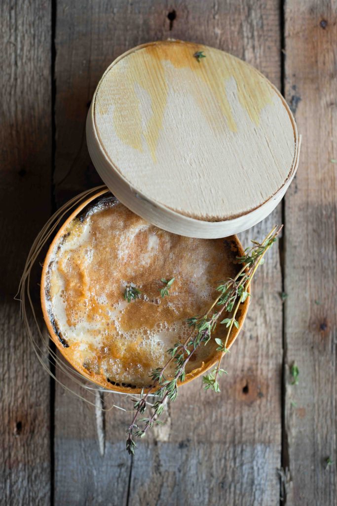You know it’s ski season when Mont d’Or arrives at your specialty cheese shop. Mont d’Or is like fondue in a wooden box, and produced only in the colder months in the Jura Mountains, along the French–Swiss border. This spoon-able cheese is wrapped in spruce bark, which gives it the subtle pine and forest notes. Mont d’Or is meant to be served warm. It becomes gooey and rich for dipping potatoes and bread, or for simply eating with a big spoon right out of the box. The good news is you don’t need to do much to prep your cheese, but our Mont d’Or recipe takes it to the next level with winter truffles.