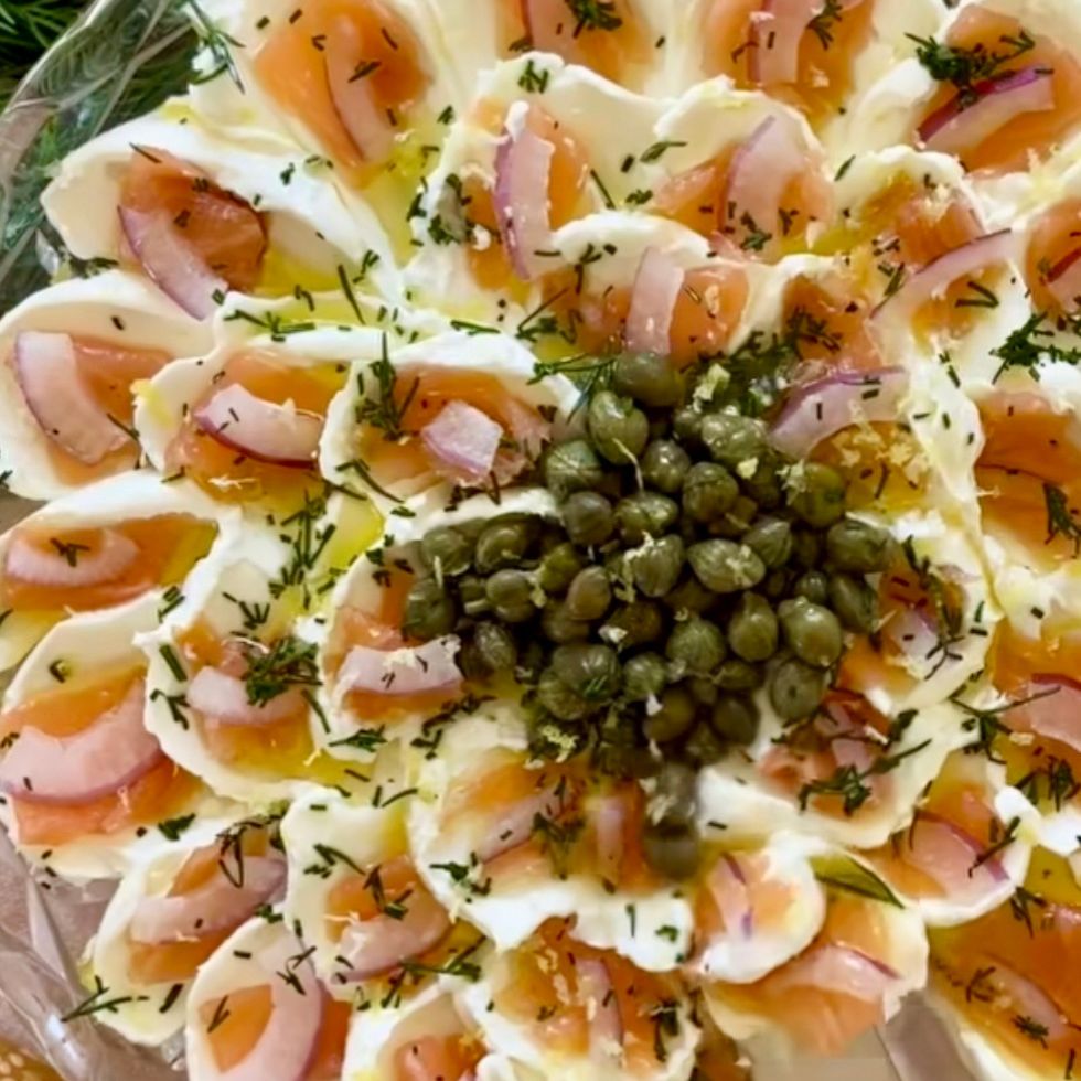 Fold in the chopped smoked salmon, capers, red onion, and dill with the cream cheese on the plate. Top it with the remaining capers to give it the look of a flower.