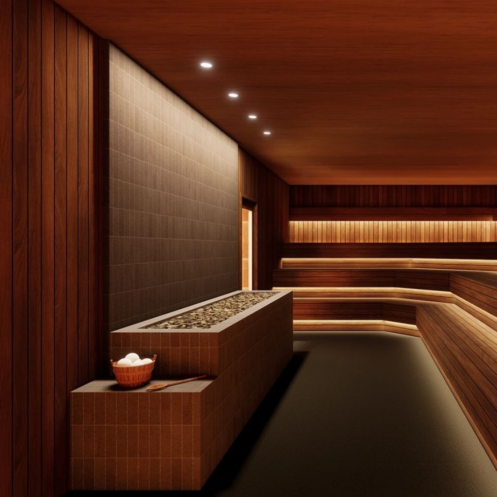 Experiences are optional, but immersive workshops offer a more social dimension. Options include guided cold-water soaks, focused on group breathwork, in-sauna aromatherapy with essential oil–infused snowballs, guided stretching, Aufguss (a German towel-waving ceremony), and sauna sound baths. The straightforward design doesn’t overcomplicate wellness; the focus is on results.