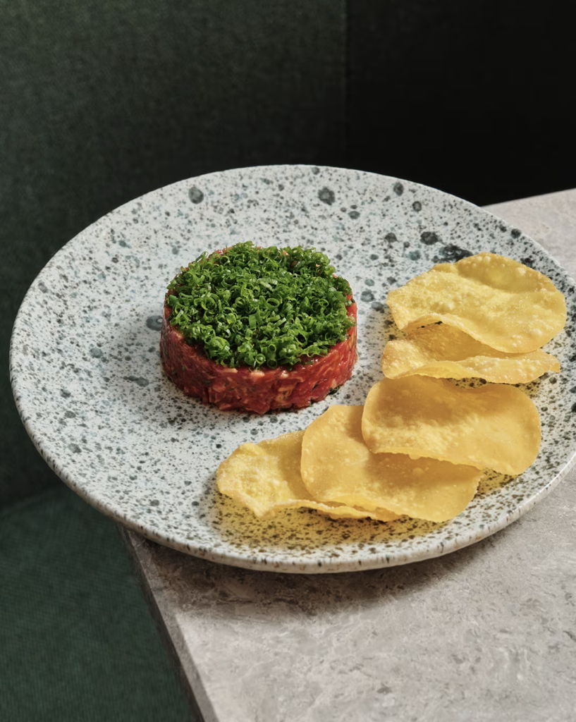 The menu is a playful nod to Swiss classics, but given a Singaporean makeover. For a savory experience, there’s the Golden Roesti — a luxurious take on the classic roesti, reimagined in bite-sized portions and adorned with caviar and gold flakes. There’s also the Spiced Beef Tartare, where the traditional recipe takes an exciting turn with the addition of sriracha, served alongside crispy wonton skins.