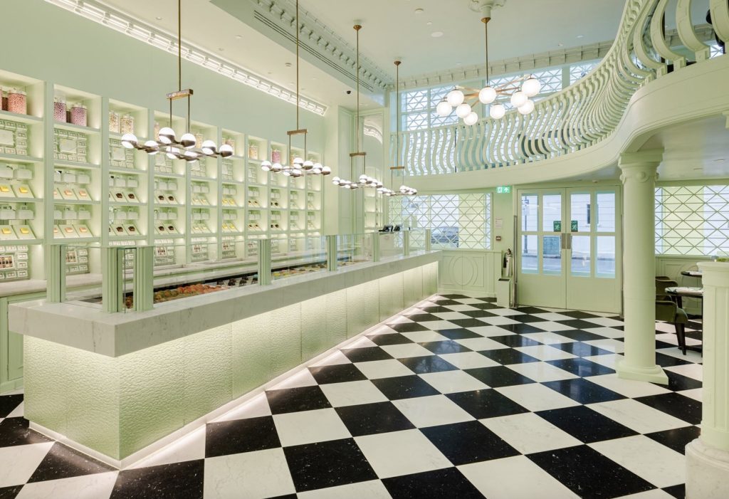 The London Prada Caffè and its Singaporean equivalent look extremely similar, so we can probably expect the same of the New York City iteration. From the floral bas-reliefs walls to the counters, shelves, banquettes, and chairs, Prada cafés are dominated by a relaxing seafoam green color. But not everything is monochromatic; the black-and-white chequered floors add a touch of retro extravagance to the space, and break the sensation of being in an underwater world (in the best way).