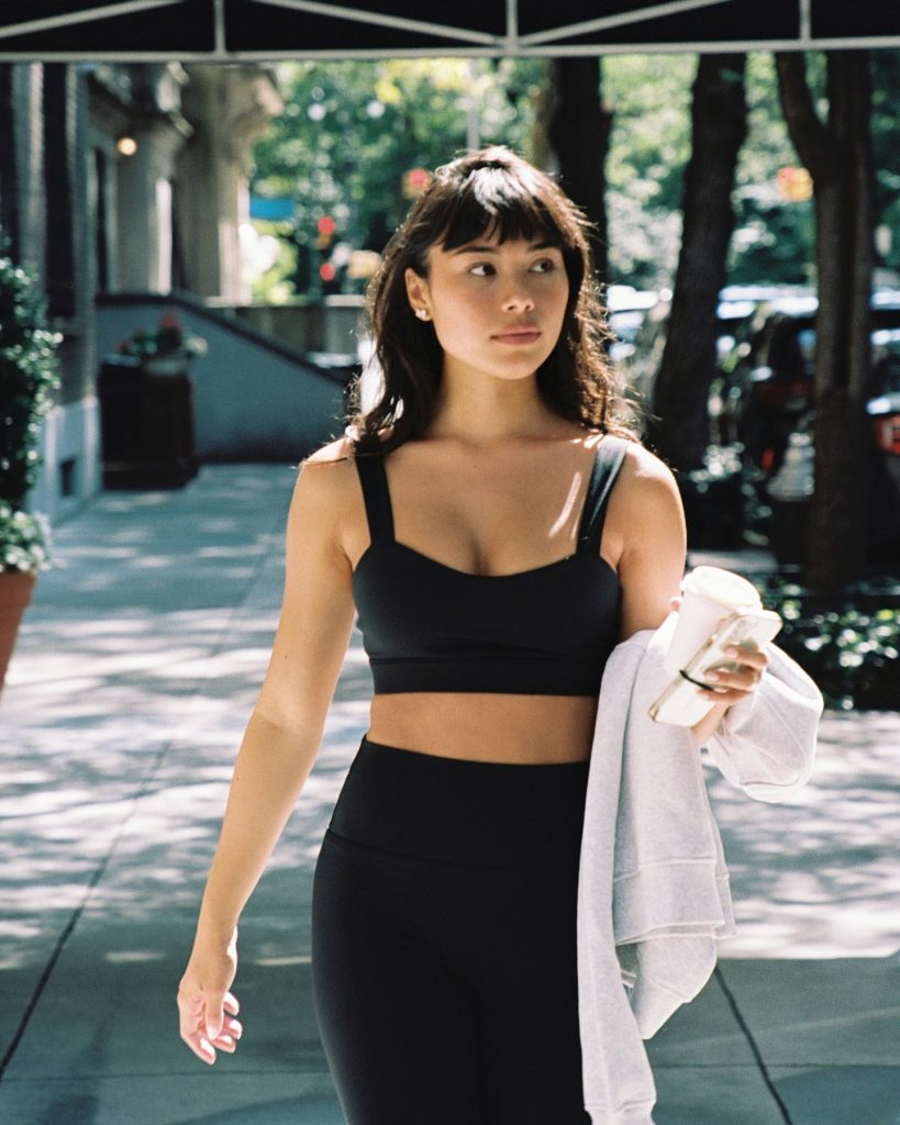 We don’t quite get the name, but they had us at scalloped edges — a signature look of Wiskii Active. We also like the diversity of colors in their workout line. Case in point: that deep orange they’re rocking this season. It’s enough to get you into a yoga class just to wear the clothes.